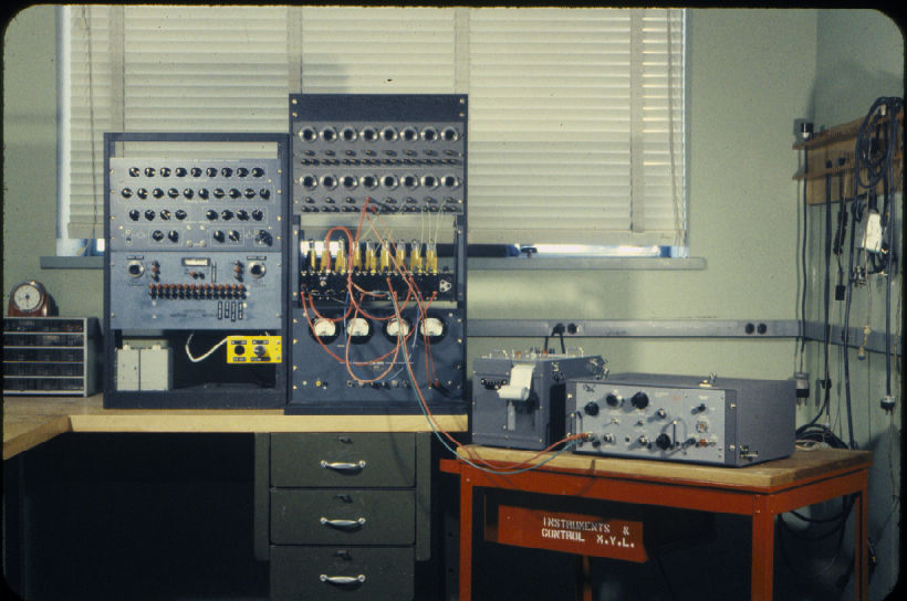 I found it! This was one of the "process control simulation" computer setups we used in the "Instruments Development Section" of Procter & Gamble's Engineering Development Division about 1959 or 1960.