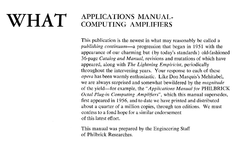 *** Hi, guys, I contributed a very small part of that Apps Manual. I don't recall if I did contribute anything more than the F-to-V converter. Certainly not much. So, about 1/2 page. I did very little of the proof-reading or checking.