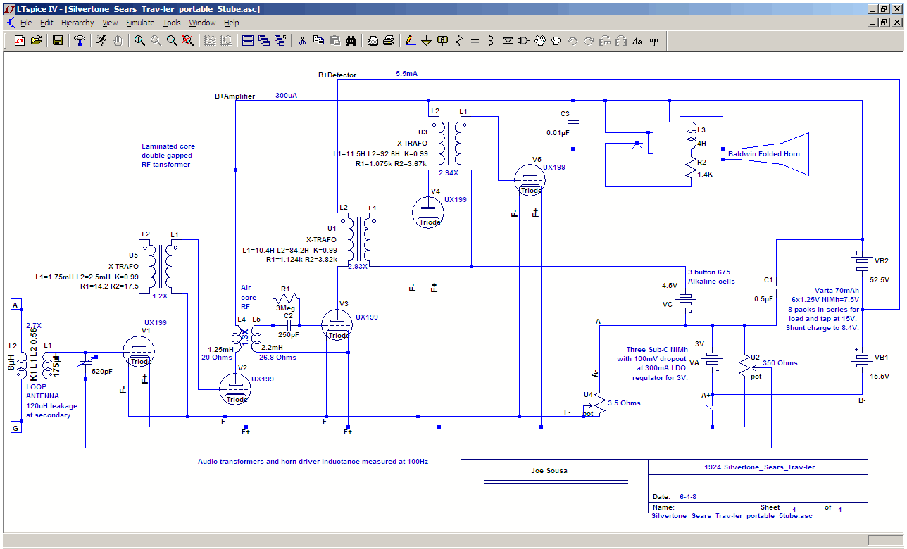 LTSpice shematic 5 tube portable Trav-ler zipped file suitable for editing. Includes screen shots, and a simulatable version with symbols and models.