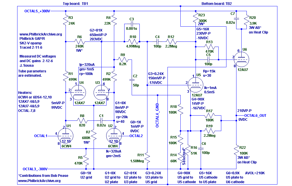 George Philbrick designed (or helped design) this amplifier. This is quite apparent, as the triode based positive feedback topology at the output is very similar to the K2-W topology, which he also designed. Come to think of it, an improved K2-W using a 12AX7 and a 12AU7 could be built based on this SK2-V design, where the circuitry around the 12AU7 would be retained and the Nuvistor&12AX7 front end would be replaced with the simpler single 12AX7 K2-W front end. This improved design would have Avol comparable to the original K2-W ( ~10k), but the output swing would double to +/-100V. This design would also be a more elegant version of the difficult designs in the K2-X and K2-XA. This improved K2-W would not only be transistor free, unlike the K2-XA, it would also be pentode free; supreme elegance!