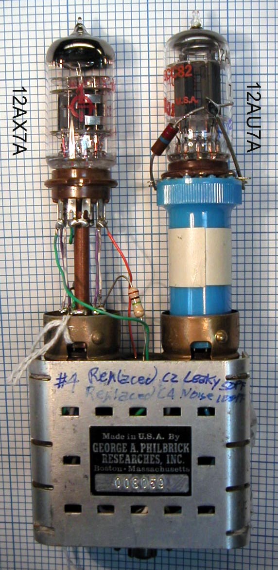 This modification can be done to the SK2-V in a temporary fashion. I used an adapter socket at the 12AX7 as shown in the pictures below. I jumpered several wires straight through, and brought out the 12AX7 grid inputs to the grid socket connections at the Nuvistor (6CW4) sockets. I tied an extra 1Meg resistor from the 12AX7 cathodes to the Nuvistor socket cathodes to bring the 12AX7 bias current to the same current as the removed Nuvistors. You will notice in the photos that I replace to defective ceramic capacitors in this module with two new mica caps.
