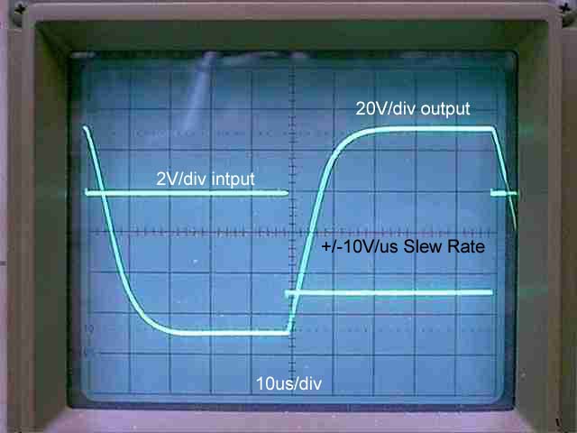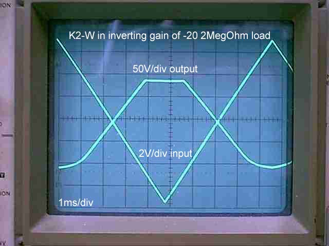 This unit shows gains near 1 million for output voltages less than +/-20V, but gain drops off as the rated swing of +/-50V is reached. The internal positve feedback near the center of the transfer function is just right.